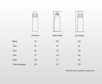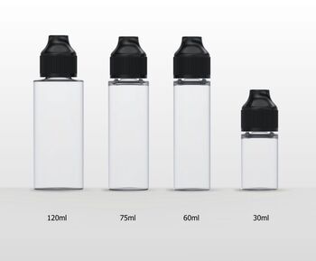 Flacons à remplissage partiel d’e-liquide en formats 30 ml, 60 ml, 75 ml et 120 ml. Tous nos flacons sont conformes à la Directive européenne sur les produits du tabac