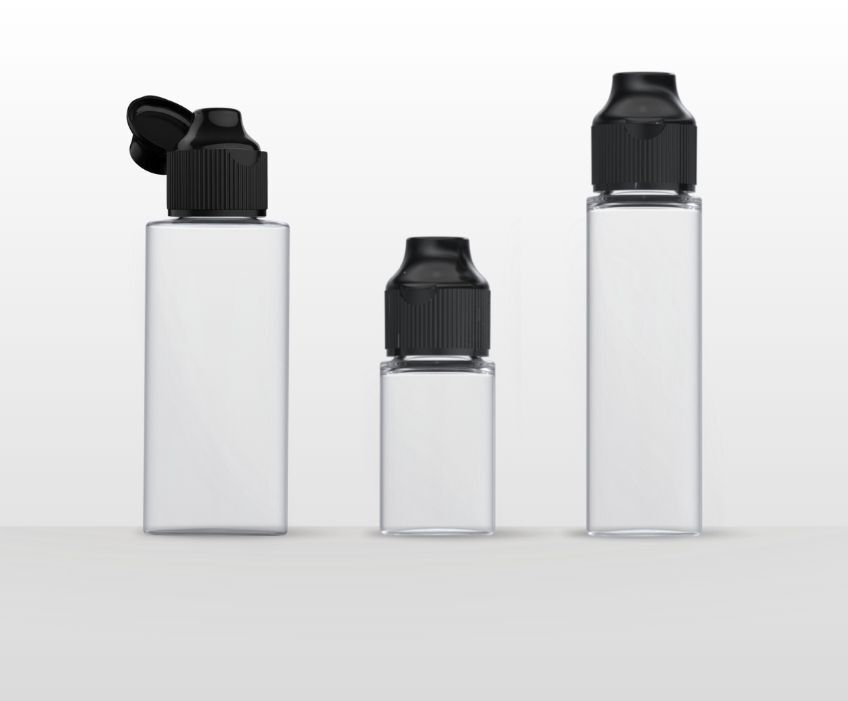 Flacons ronds : 30 ml, 60 ml, 75 ml et 120 ml disponibles en PET ou en PET recyclé (RPET)